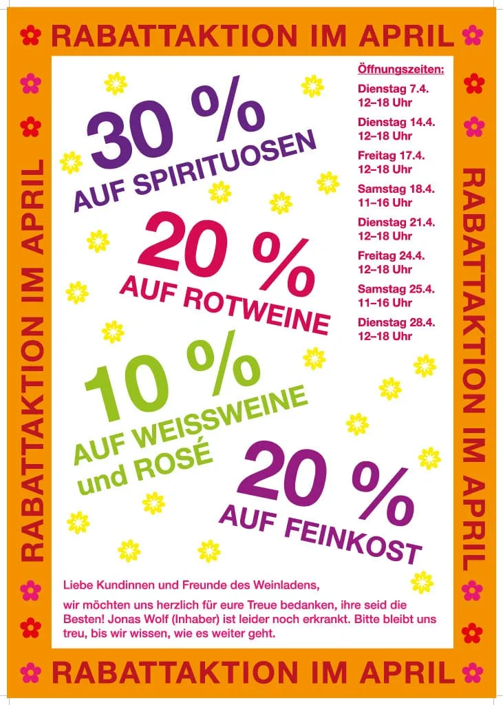 Aufgrund des andauernden Klinikaufenthalts von unserem Inhaber Jonas Wolf haben wir im April leider nur folgende Tage geöffnet: